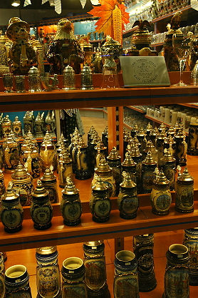 ミュンヘンの国際空港の出国イミグレを過ぎ、お土産屋さんが並ぶ通路に≪HERRMANN GIFTS≫と名の付いたビール・ジョッキを主に扱っているお店があります。小は飾り物のミニチュアから大はリットル・サイズの物まで。材質もガラス製、陶器製の蓋付き各種。実用的なサイズは一つ数ユーロからあります。