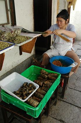 お店前の路上でこんな風に粽を包むおばさんの手付きを見守るのも一興。