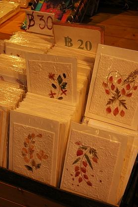素朴な風合いの手漉きの紙の中に漉き込んだり、表面に飾られている花のデザインでお値段は変わります。立体的な花よりは平面的デザインの物の方が花の形が崩れないのでお勧めです。画像の物は20~30バーツのお値段の物。SI LOM VILLAGE で見かけました。