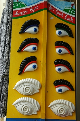 港町マルサシュロックに行くと、色鮮やかな漁船のへさきに一対の目のお守りが付いていますが、そのお土産版があちこちで売られています。