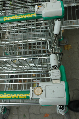 ドイツ全国共通かどうかまでは分かりませんが、ハンブルクの空港のカート使用には小銭が必要です。画像の物は空港のカートではありませんが、このように0.5、または1ユーロを置いて中に押し込むと、チェーンが外れる仕組みになっています。返す時はカート置き場で、チェーンに付いている鍵状の物をまた自分のカートに連結させると、お金が戻ってきます。