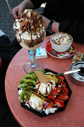 メニューには画像も付いているお店が多いので、あれこれ見比べて5ユーロ程度の物を頼むと、そのボリュームと飾り付けに圧倒されます。中には10ユーロ以上の物もありますが、それは二人用の物。一人の時うっかり頼むととても食べ切れません。
