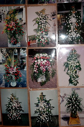 花の種類、数、デザインなどでお値段は異なりますが、この画像中央の腰ほどの高さの物は200元代~。(画像をクリックすると拡大されます。)時期によって花の種類も異なるので、お店の人に相談してみてください。