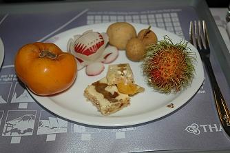 スナック、前菜、タイ・中華・洋風の中から選ぶメイン…、と続き、私がいつも一番楽しみにしているのはフルーツとチーズ。メインは頼まない時でも、これだけは必ずいただきます。季節によってフルーツは内容が変わります。この時はランブータン、竜眼、柿を頼みました。