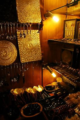 画像のようにお盆、ナプキン・リング、ナイフ、スプーン、フォークなど、材質に貝や木、銀を取り入れた東南アジア風の食卓用品の数々がばら、セットでも買えるお店がSI LOM VILLAGEに入っています。高い物だと一客分数千バーツはしますが、スパイスやコーヒー用スプーンなどの個別の物は買い求めやすいお値段。