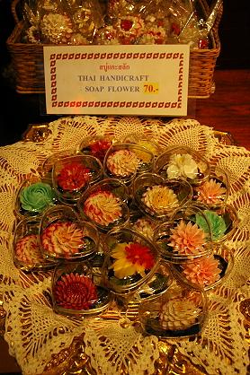 石鹸に花の彫刻と色をあしらったソープ・フラワー。これもSI LOM VILLAGEで見かけました。実用と言うより、その香りと形を楽しむインテリア小物的存在。小ダンスの引き出しに入れて、ポプリのように使うのがいいかも。掌にすっぽり入るような大きさの透明な容器に入って一個70バーツ。まとめ買いする時にはお値段も交渉してみては?