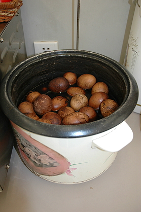 五香と言う山椒、八角、桂皮、丁子、陳皮などのスパイスと醤油、茶葉などを煮出した黒い汁の中に入っています。