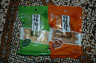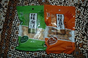 日本のおつまみ用豆菓子に似ています。≪怪味花生≫はピーナッツに衣を付けて焼き上げたもの。≪怪味蚕豆≫は殻を取ったソラマメを揚げたもの。どちらも甘辛しょっぱい≪怪しい≫味で、結構美味しいです。