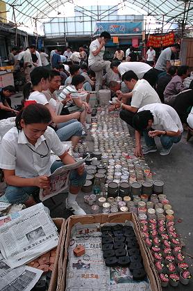 これはコオロギ同士で戦わせるのを目的とした物。安い物は数匹で10元程度から高い物は一匹でも数百元します。