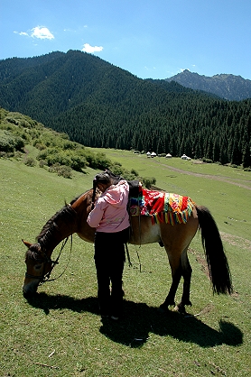 駐車場で車を下りると、カザフ族の人たちにたちまち「馬に乗れ。」と何重にも取り囲まれますが、「いらない。」と言って歩き始め、付いて来る人が少なくなってから落ち着いて交渉してみるのが○。馬を扱う人の様子をよく見てから決めるのがいいと思います。