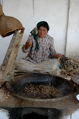 ここでは、繭を大鍋で煮て糸を取るところから始まる、ウイグル族独特の色鮮やかな絣模様の絹織物を生産する様子が見られます。糸を紡ぐ、染める、それを機織り機にかけて織る、など全て手作業の工程を見学するのが興味深い所。