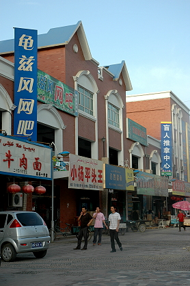 衣料品店や食堂も並ぶ中に、画像左にも出ている≪亀茲風網吧≫と言うネット・カフェもありました。ここはデポジット10元で、使用料は30分1元。PCが40台ほどもあり、地元の学生で賑わっていました。