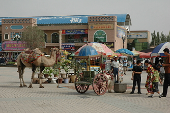 ここ数年、新疆ウイグル自治区の変貌振りは大きいようで、エイティガール・モスク周辺にもショッピング・アーケードや地下街が出来ました。モスクに面した側はお土産店も入って賑わっていますが、05年7月下旬時点では中はまだガラガラと言う感じ。画像のようにきれいに整備されたモスク前広場にはラクダのアトラクションも。