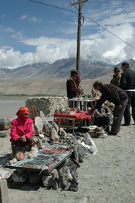 喀什(カシュガル)からカラクリ湖に向かうと、手前には別の湖もあって、そこには画像のようなお店が並んでいます。商品は?と見てみると、刺繍されたカーペットや色とりどりの鉱石類とアクセサリー製品が主。
