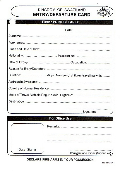 私たちはスワジランド北側のMATSAMOから入国。画像の入国カードを記入しました。
