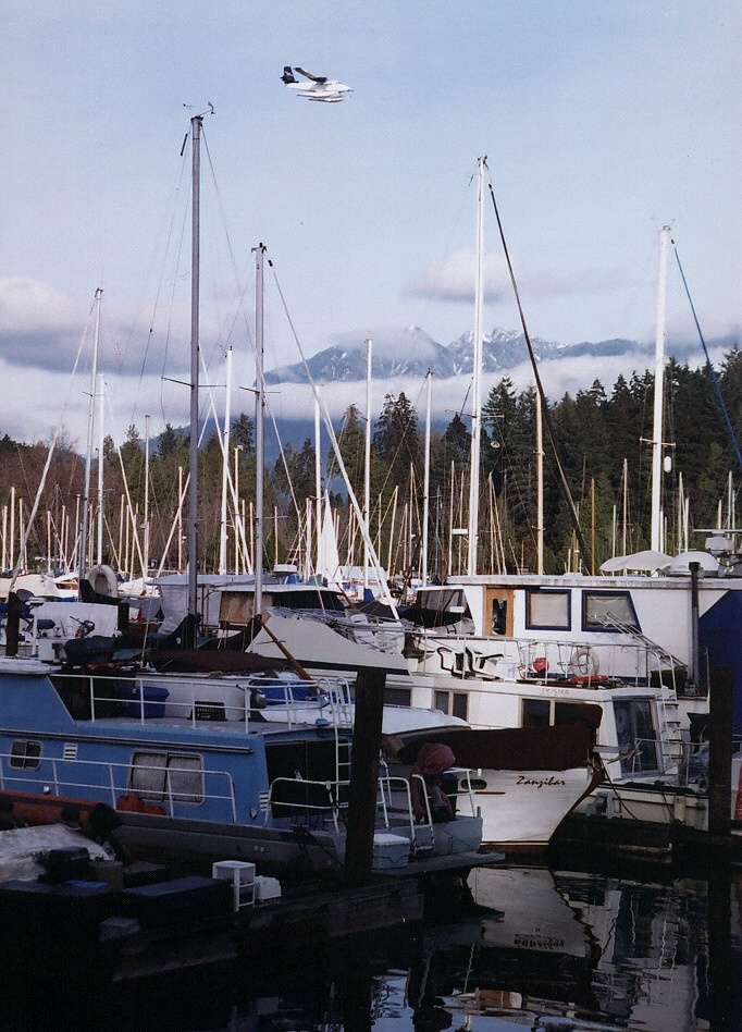 THE WESTIN BAYSHORE RESORTのあたりから、バラード入り江に沿って遊歩道があります。雪山と瀟洒なヨットの取り合わせがシュールな光景。水上飛行機が発着する様子も見られます。