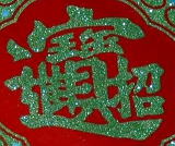 この画像の字は、4つの漢字を組み合わせて1つの漢字のようにしてあります。旧正月にはシンガポールに限らず、中国人が多く住む国や地域でこのような文字を書いた紙を家やお店の前に貼り付けます。答は『招財進寶』。