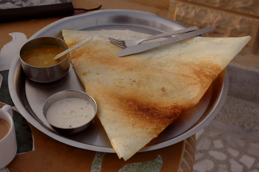 大きなクレープのような皮の中に、マイルドなカレー風味で煮付けたジャガイモが入っています。付け合せはどこでも大体黄色いサンバル(タマリンド風味の辛酸っぱい野菜スープ)と白いココナッツのチャッツネ。