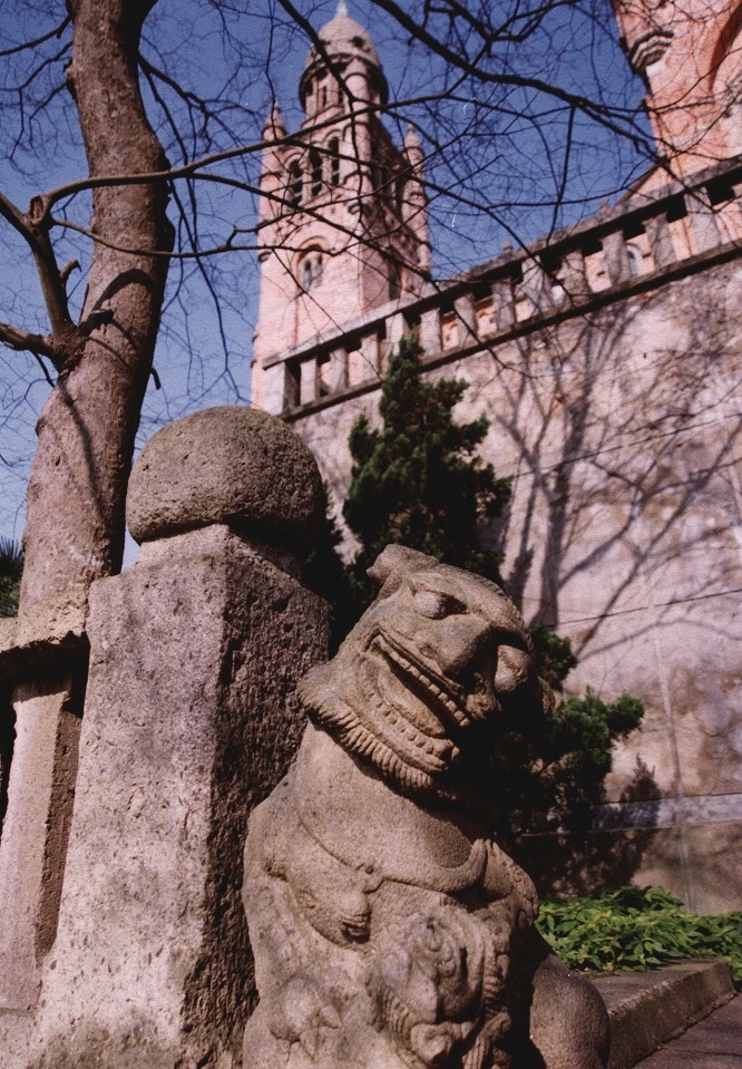 山頂聖母大堂は、中国でも古い歴史のあるローマ様式+カトリック様式の入り混じった大きな教会。丘の麓からはロープウェイもありますが、歩いて登るのをお勧めします。途中の参道には、なぜか画像のように狛犬も立っています。