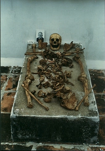 マカオには、埋葬した数年後に遺骨を掘り出して清め、新たな容器に入れ直して別の場所に埋葬する風習があります。たまたま立ち寄った教会でも、その日は遺骨の掘り起こし作業がされていました。この写真では見えにくいですが、生前の写真を焼き付けた陶板と上下の総入れ歯も置いてあります。