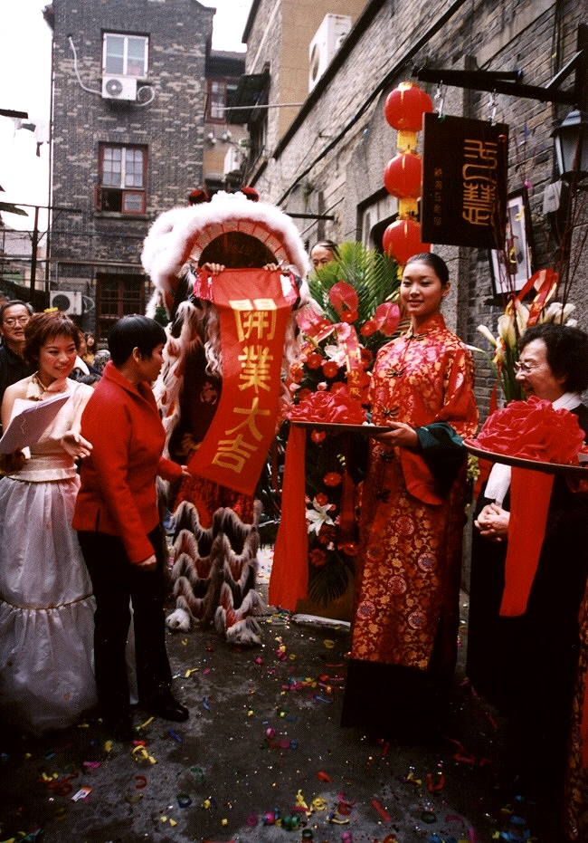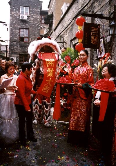 画像は、オープンした服飾デザイン店のセレモニー風景。獅子の口から開業大吉と書かれた布が出ています。