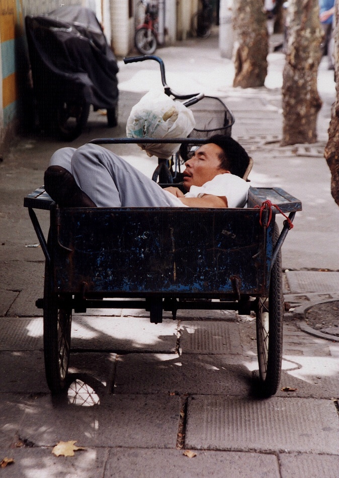 今でこそ、新天地や繁華街である淮海路もある地区ですが、隣の南市区よりでは、路上で昼寝などする市民の姿も。寒い時期はさすがに見られませんが、気候のいい時期はこのとおり。
