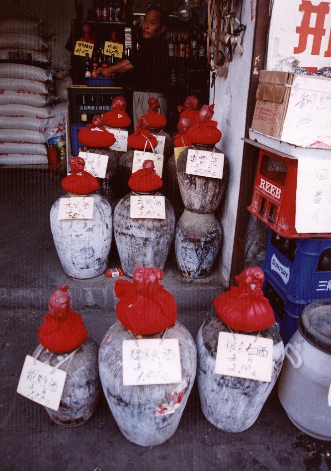 画像は雑貨屋さん。街中の店頭に並ぶのは、瓶詰めにした物が多いのですが、下町では産地から送られてきたお酒をそのまま壺売りにしている所も多く見られます。もちろん自分の入れ物を持って行って、この中から量り売りもしてもらえます。- 旅行時期