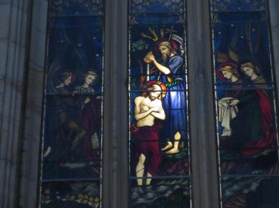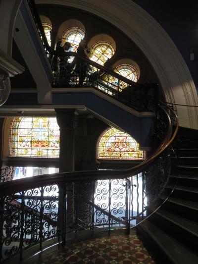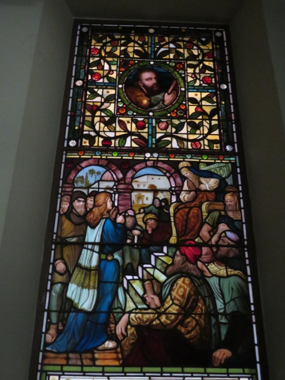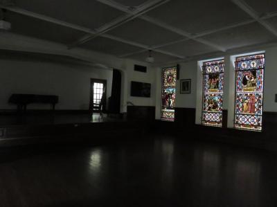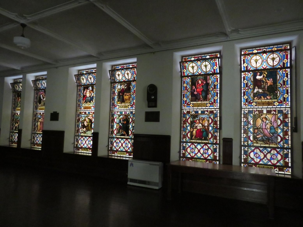その半地下室は殺風景な集会所的スペースでも、外からの光を透かすステンドグラスの佇まいが神聖な美しさで、いい物を見せていただいたと思いました。