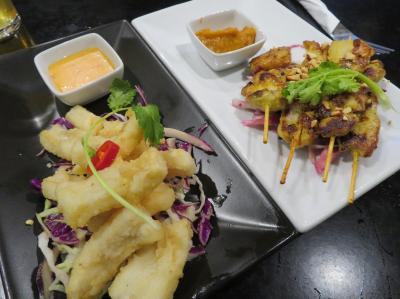 前菜に頼んだイカのフリッターや鶏肉のサテーは見た目もソースを含む味付けも「お!」と思うほどよくて感激!