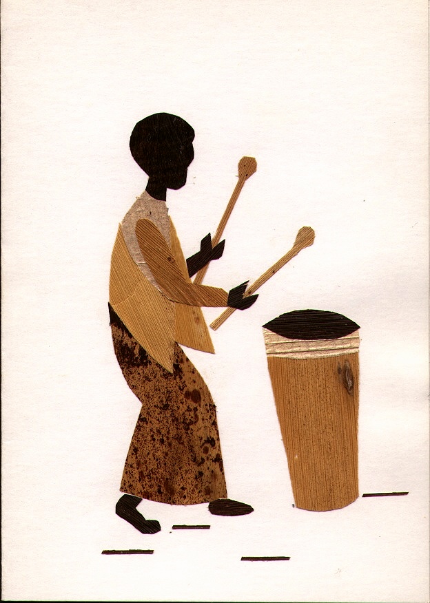 ずいぶん前の話ですが、地元の人たちに手職を付けさせる外国の団体が開いているお店には、バナナの葉を切って貼り付けた貼り絵が売られていました。これはグリーティング・カードですが、額に入れて飾るタイプの大きめのサイズの物もありました。