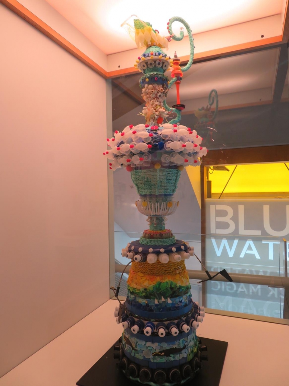 海洋ゴミで作られたトロフィーがあり、寿司折りやお弁当に入れる醤油容器が多数使われていたのはショッキング!