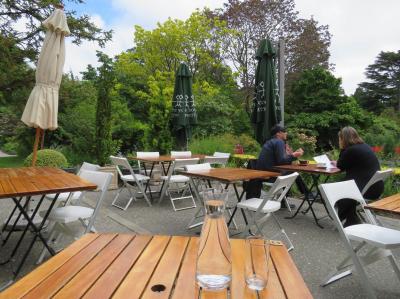 11月中旬には、植物園の植え込みの生き生きとした緑や、お店傍らに植えてある白い藤の花がきれい。