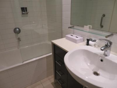 新しく清潔で広さのあるアパート・タイプで、キッチンも洗濯機+乾燥機もあってとても便利。