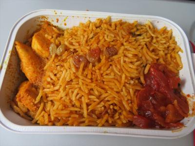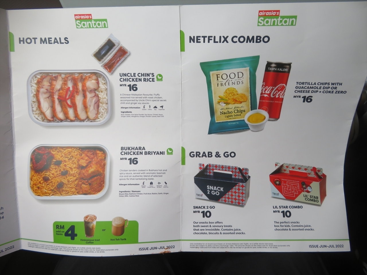 マレーシアご飯の機内食やスナック、飲み物類は機内で買えますが、私たちはチキン・ビリヤニ(スパイスの効いた炊き込みご飯)を予約していきました。