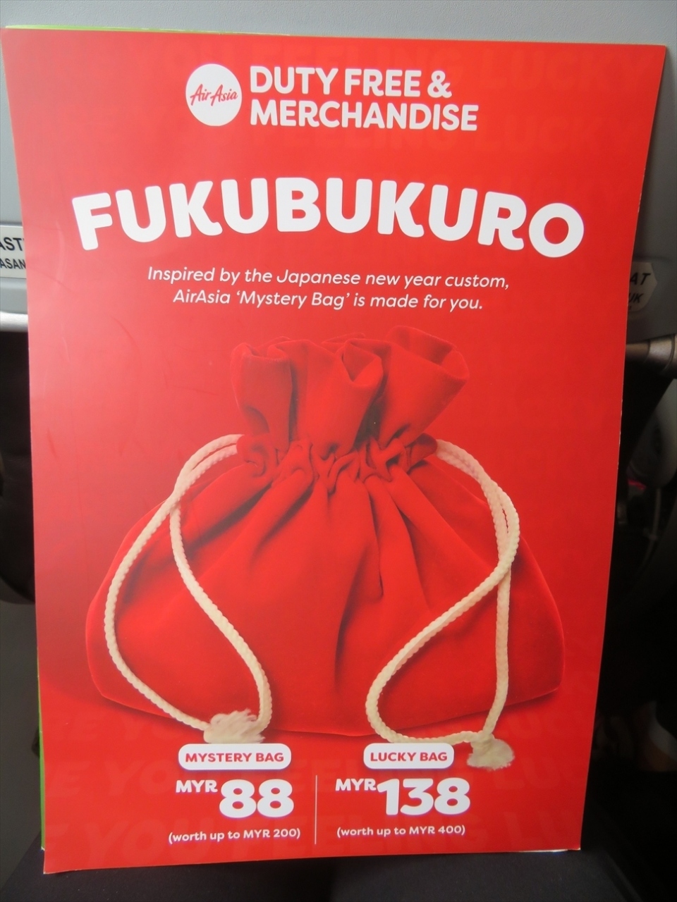 ほかにも、機内ではエア・アジアのグッズや免税品が少々、それにFUKUBUKUROと称した福袋も販売されていて興味有りでしたが、せっかく買っても中身が好みの物でなければガッカリするな、と断念しました。(笑)- 旅行時期
