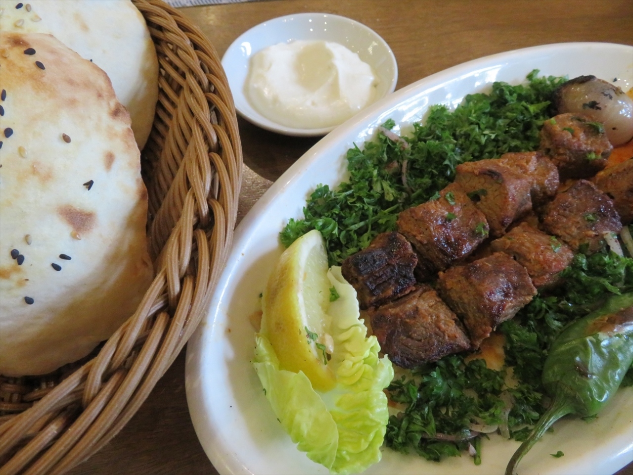 私たちは、フムス(ヒヨコ豆とゴマのペースト)、ほかほかのピタパン、ギリシア風サラダ、ラム肉の串焼きを取ってシェア。