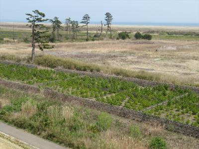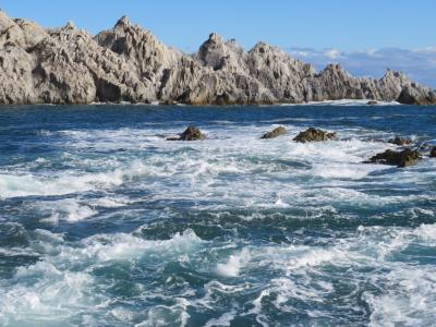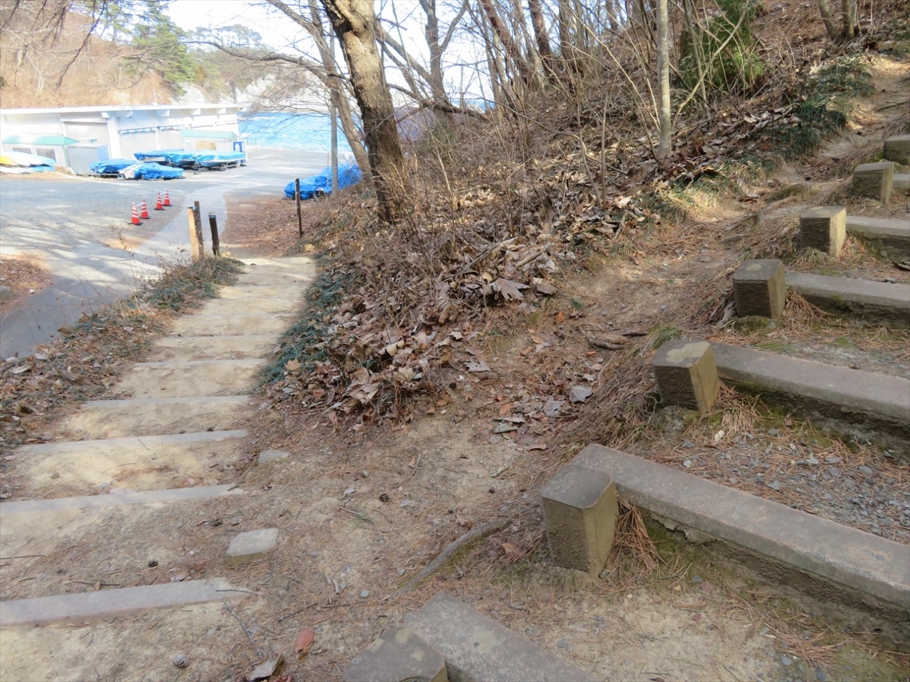 展望台への遊歩道では、木々の合間に浄土ヶ浜の白い岩並みが見えて来て、晴れた日には海と空の青とのコントラストがきれい。