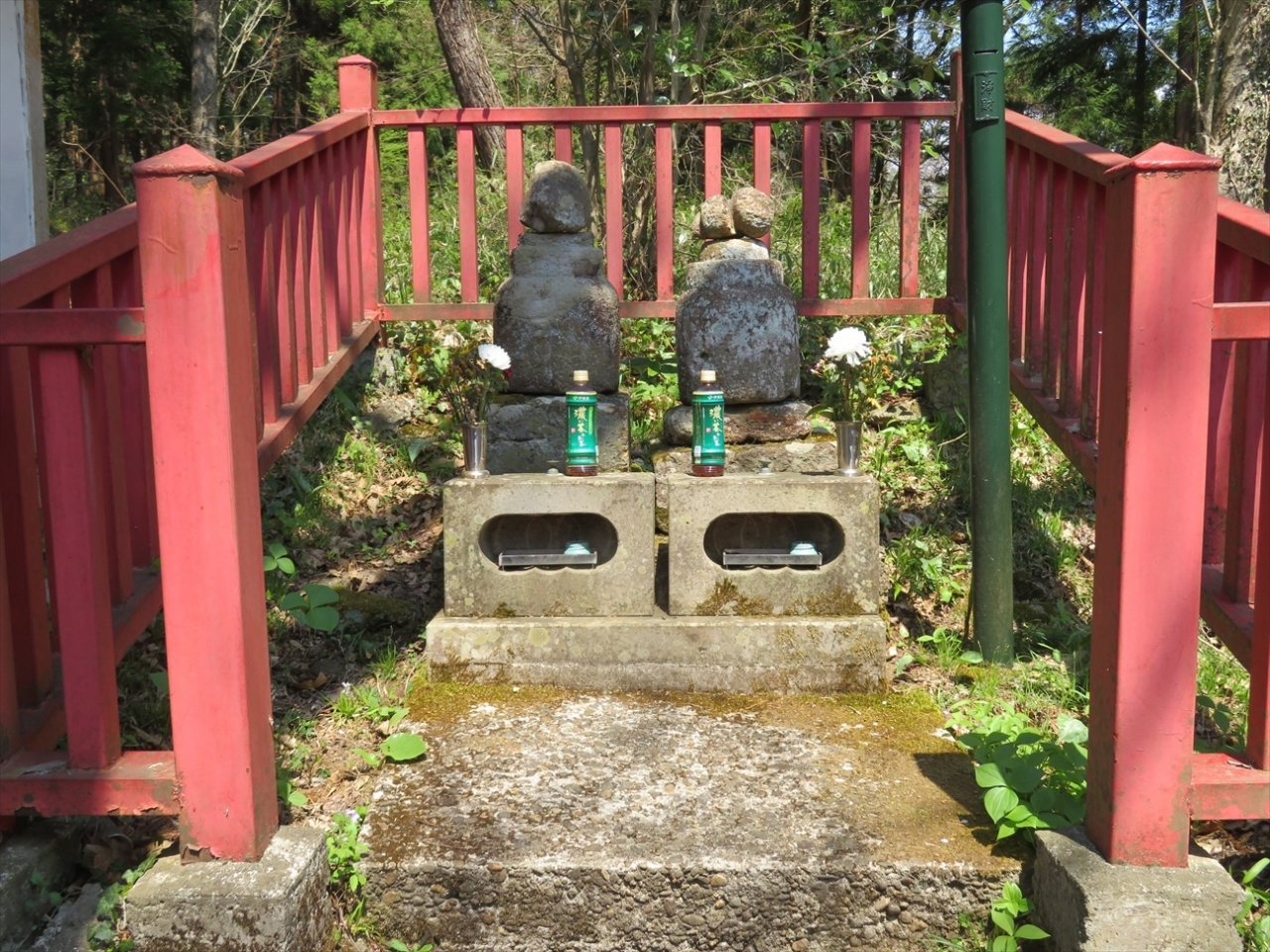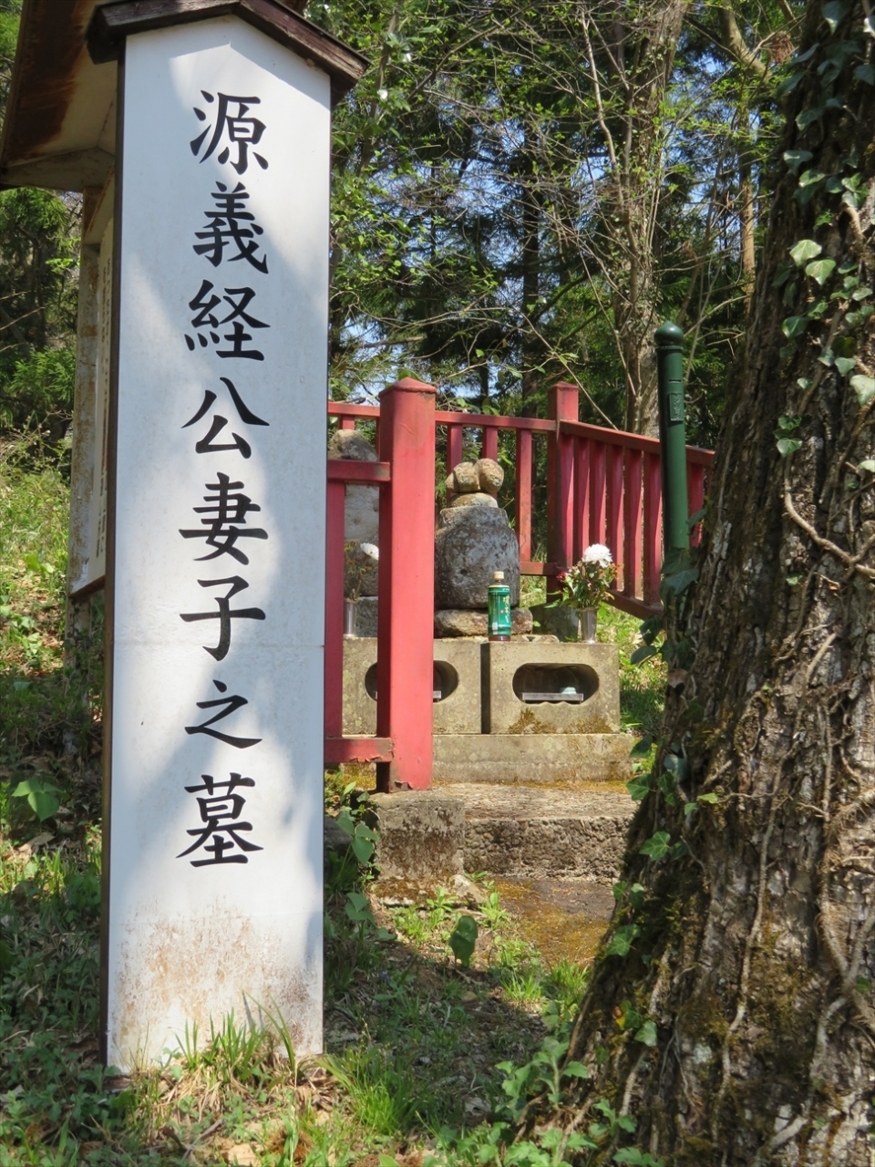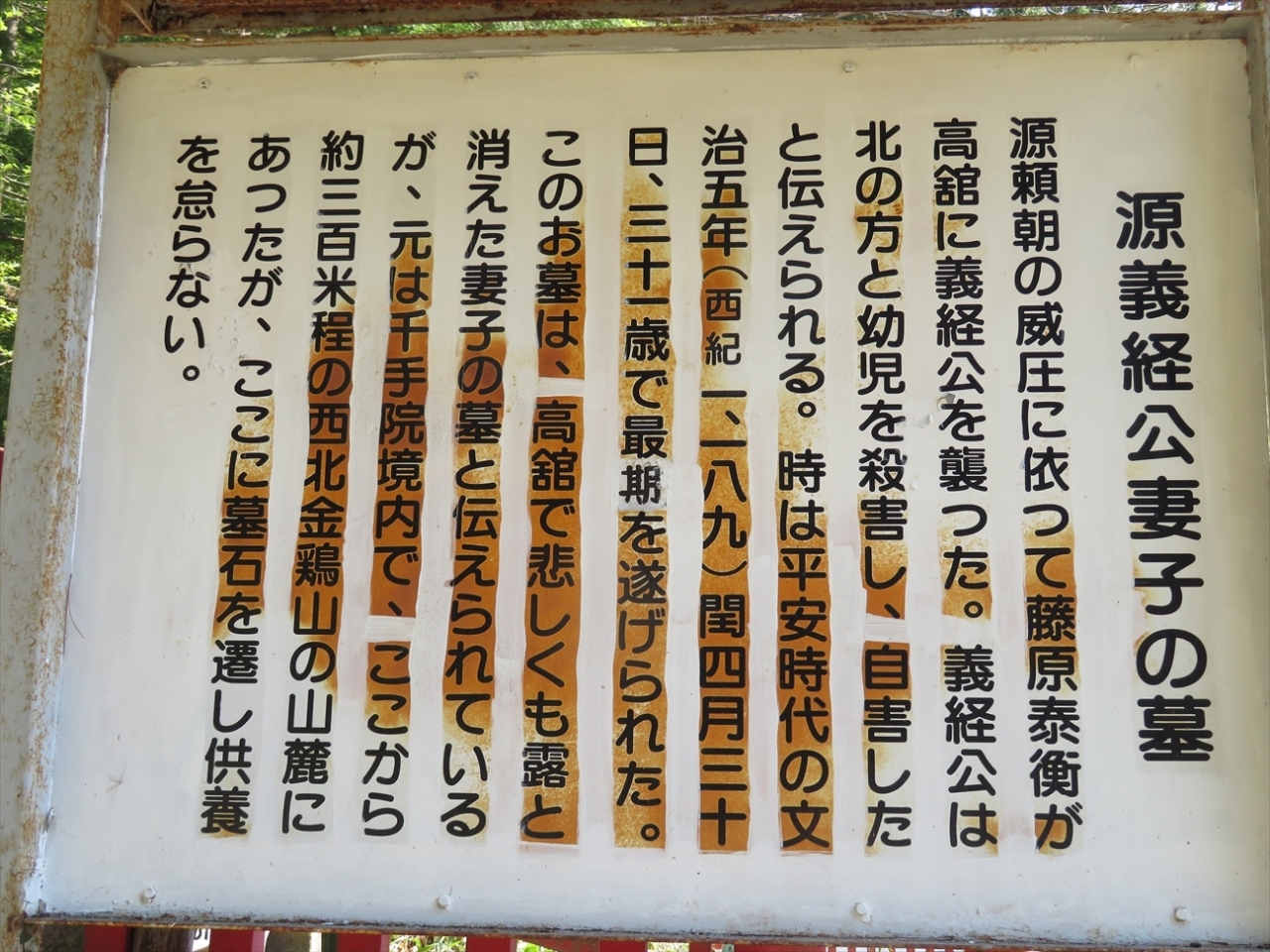 赤い柵に囲まれた源義経公妻子の墓は一段高い場所にあり、ウォーキングトレイルのすぐ脇。見落とすことはありません。