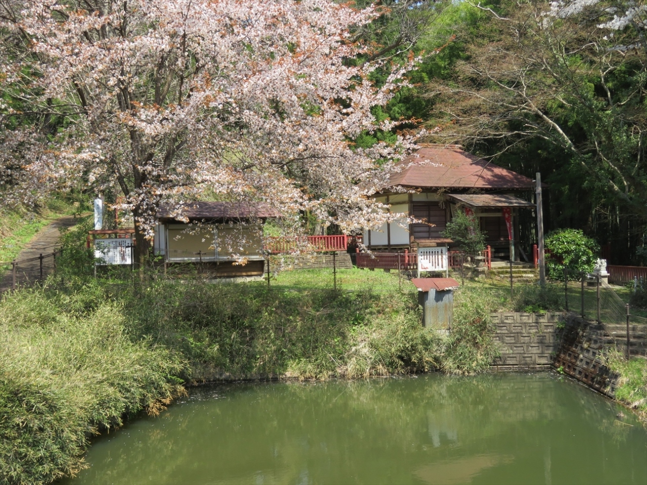 民家が多い道筋ではなく、この辺りの桜の名所になっている溜池や右近清水(うこんしみず)へと下りて行く坂道の上にあります。