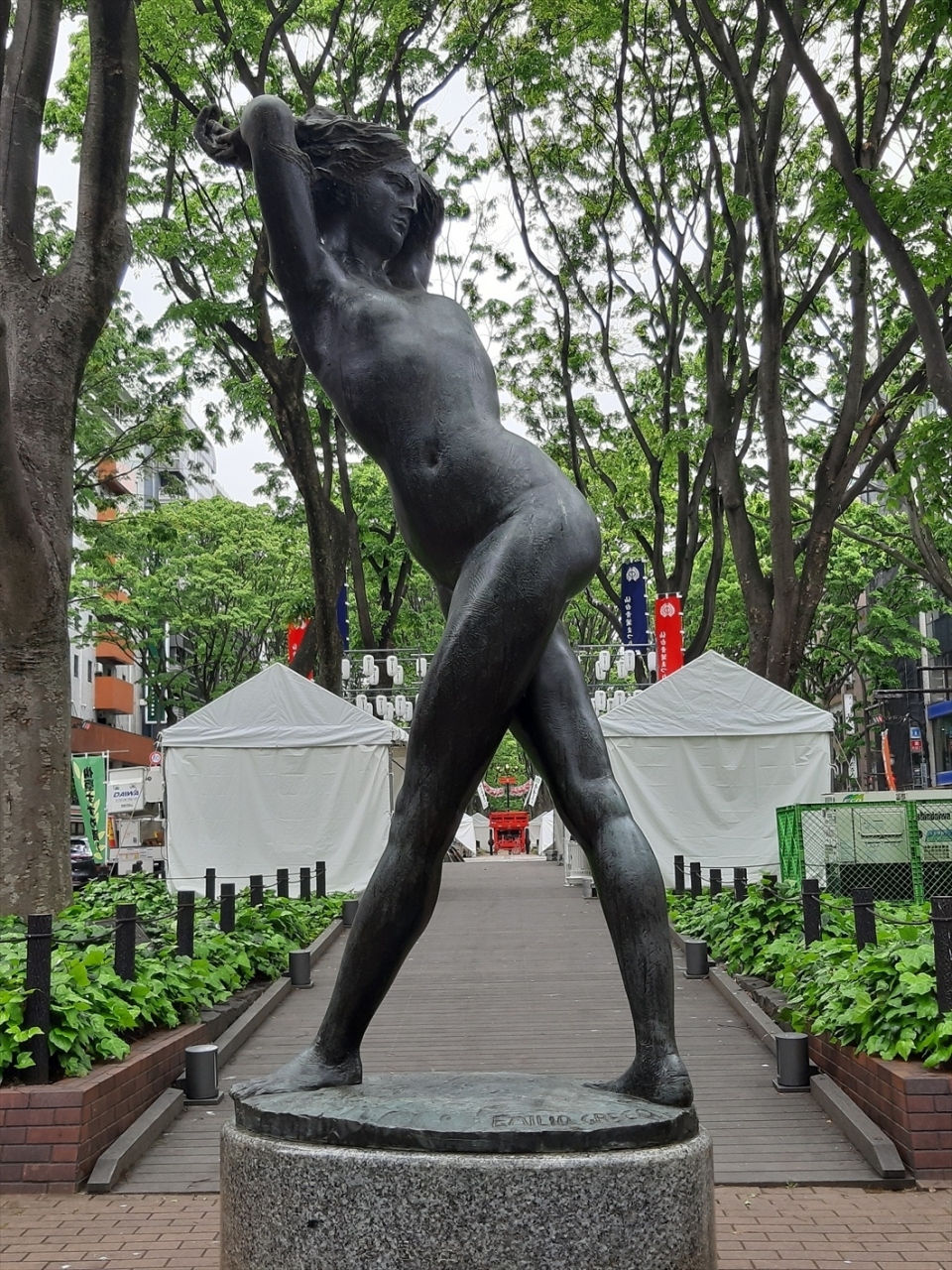 2022年5月14日・15日には、規模は縮小されるとはいえ三年ぶりに青葉まつりが開催されるため、13日には≪夏の思い出≫の裸婦像周辺にもテント席などが設置され、去年までとは一味も二味も違う風景になっていました。