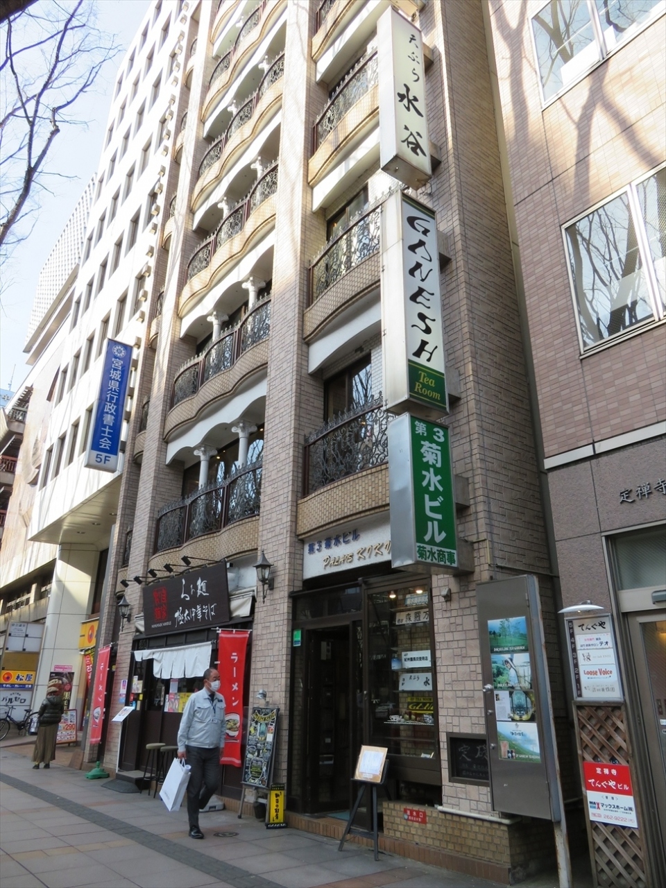 ≪天ぷら 水谷≫があるのは、国分町通りと定禅寺通りの角。仙台メディアテークと同じ並びにあります。