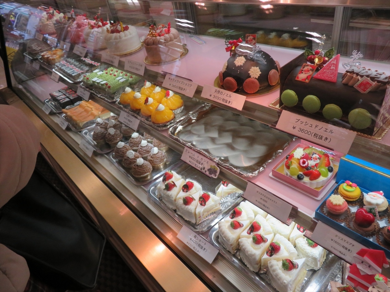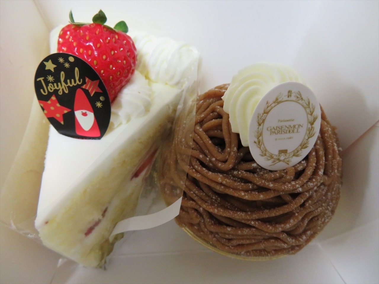 私が行ったのはちょうどクリスマス・シーズンだったのでクリスマス仕様のお菓子が勢揃いしていましたが、私が買ってみたのはクリスマスとは関係の無い定番の苺ショートとモンブラン。