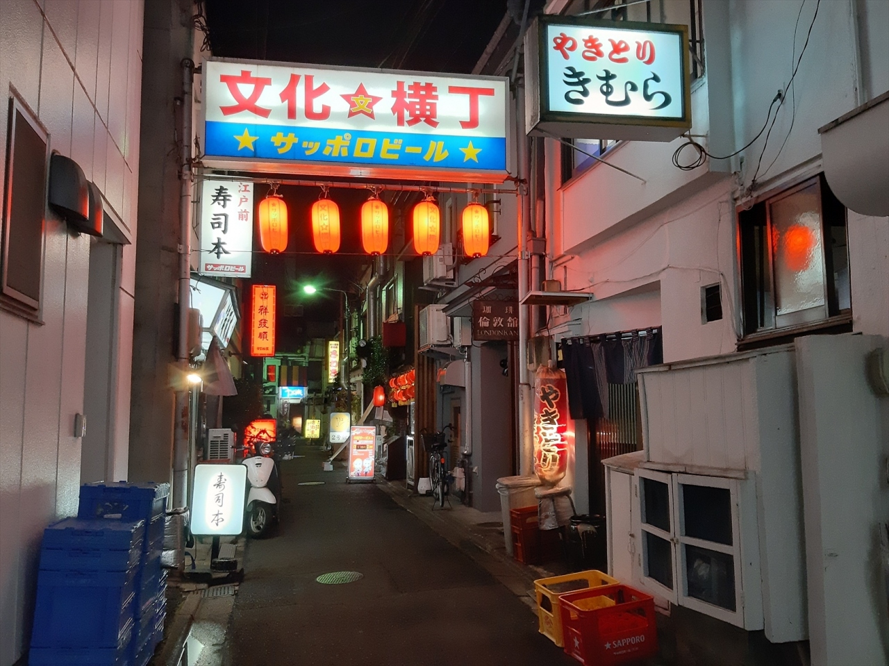 文化横丁は細い路地ですが、その路地に入るとすぐ二階への入口があり、メニューが外にもびっしり貼り出されていてすぐ分かります。