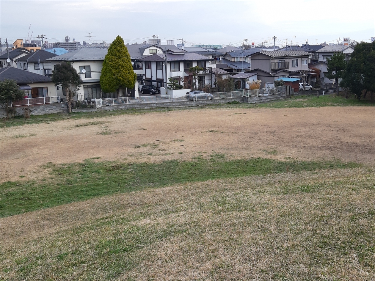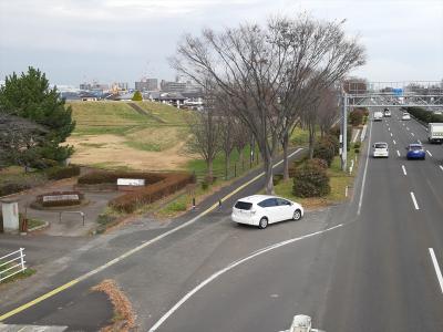 遠見塚古墳近くには歩道橋がありますが、そこから見てもはっきり前方後円墳には見えないのが残念。