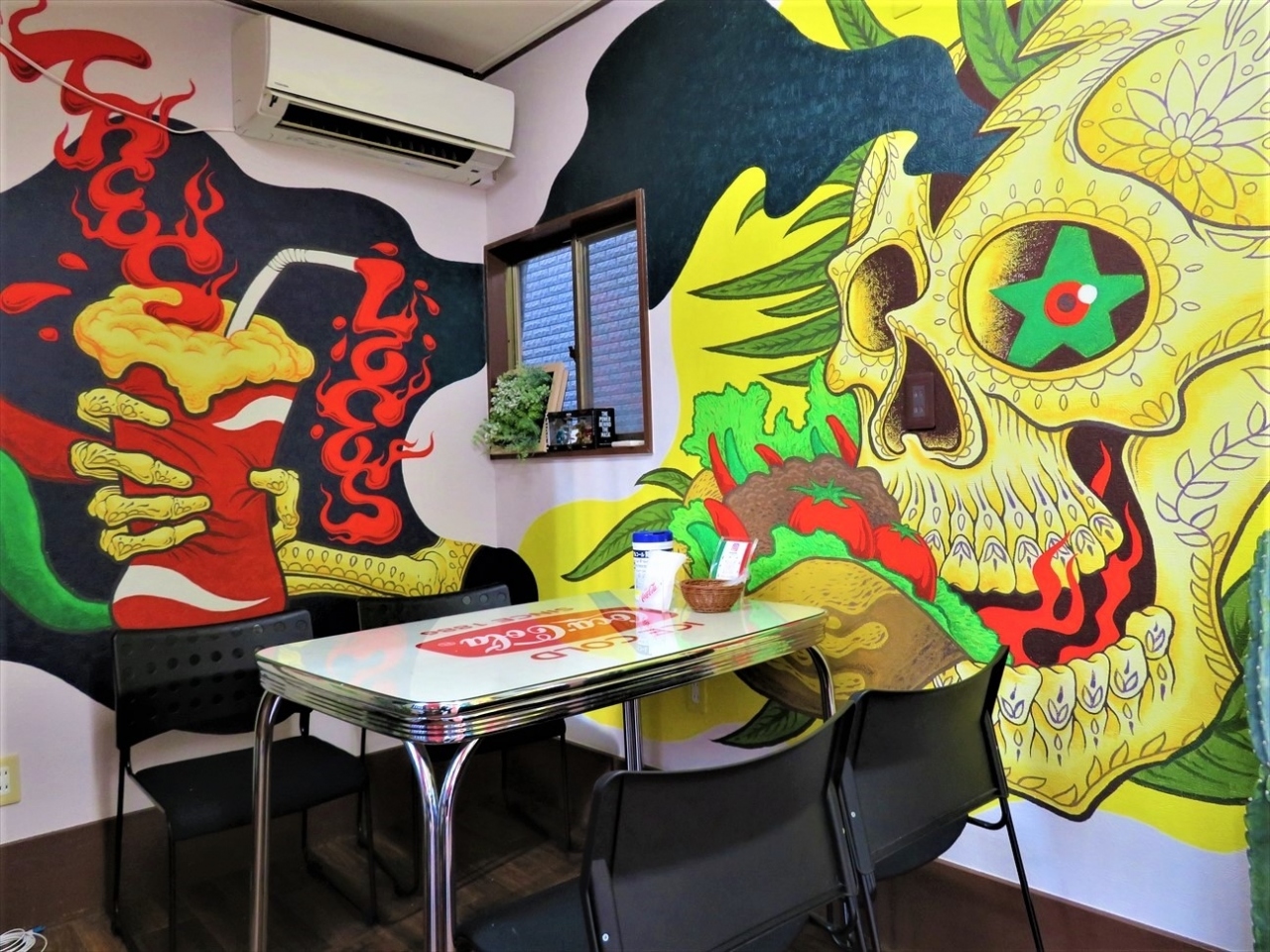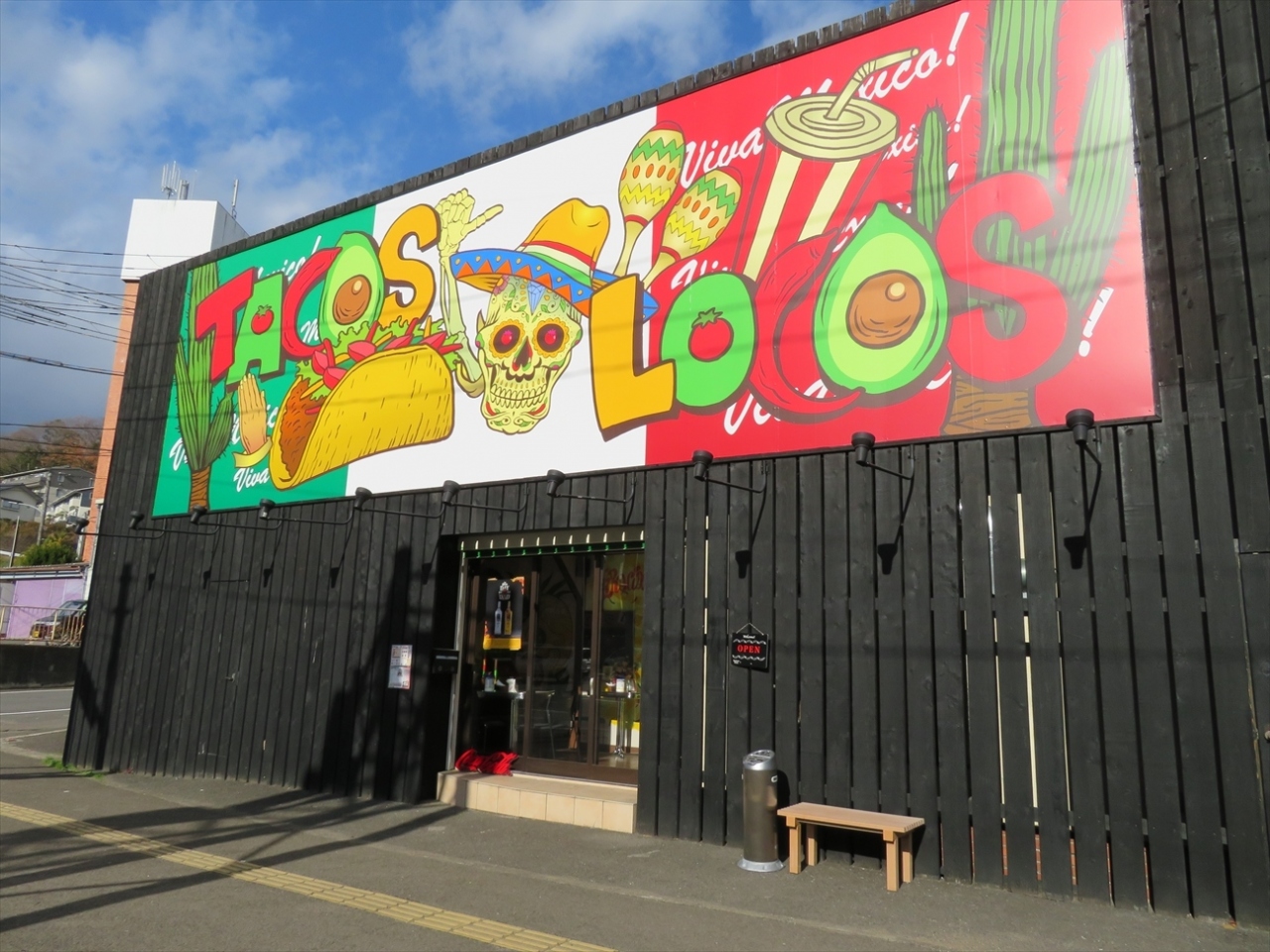 黒地の壁にポップな色合いのお店のロゴやソンブレロをかぶった骸骨の絵がある看板が出ていてすぐ分かります。