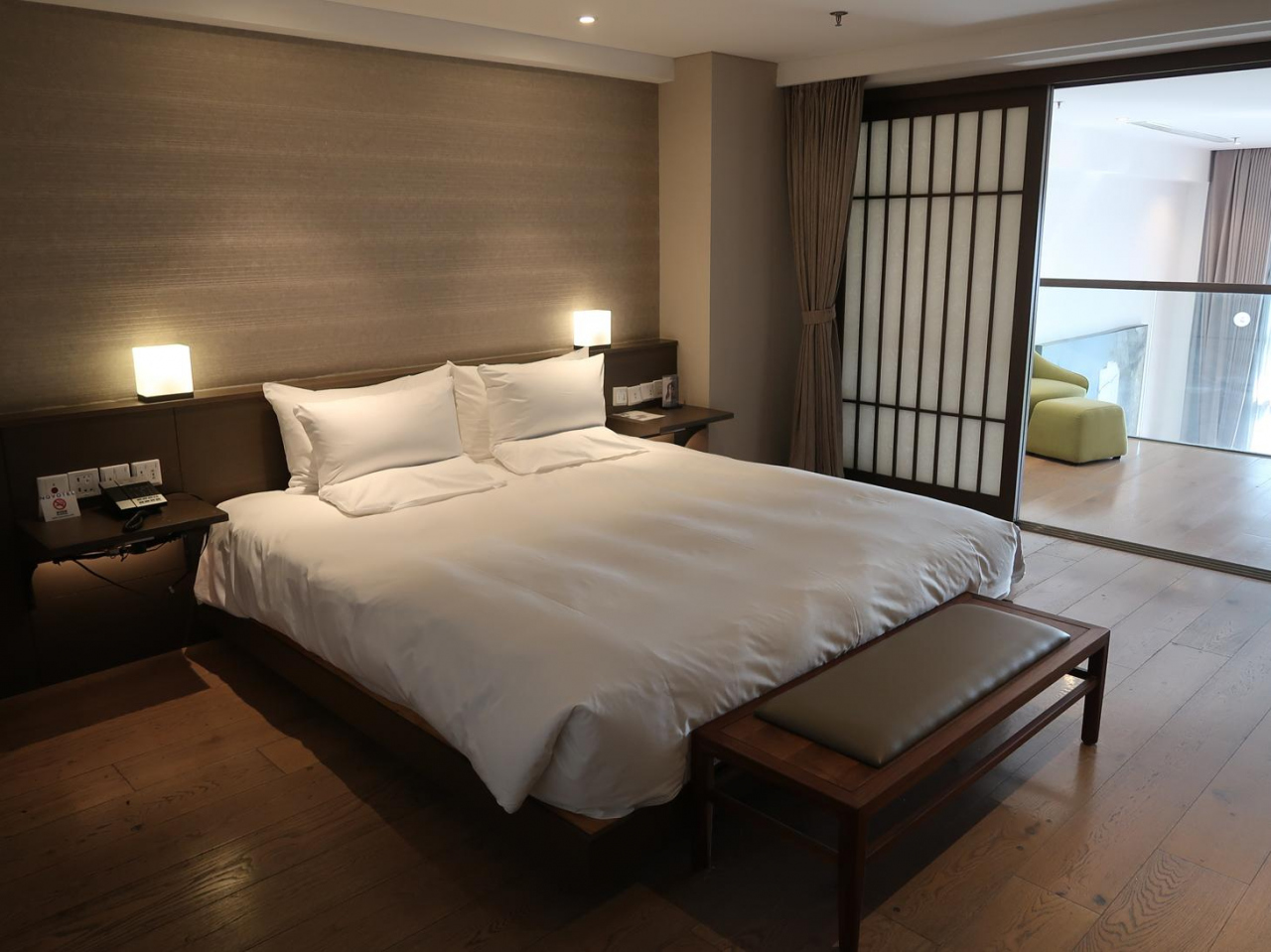 メゾネットの二階部分にある寝室は和風の落ち着いた内装でベッドも寝心地よくて大満足。