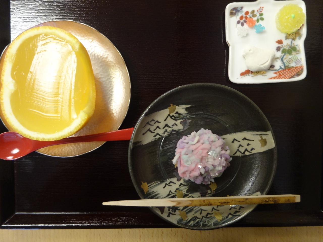 寺町通を歩いて、狭い間口でしたが、1階は、お菓子の販売、2階は、お茶が頂けました。下で、今月の生菓子をのぞいて、注文の時、尋ねると、お重にお菓子を持ってきていただき、そこから選びました。お茶とセットで、お茶は、抹茶3種煎茶3種番茶3種の中から1つ選びました。夏みかんゼリ−がこの季節いろんなお菓子屋さんで作っていて、このお店でも。1個の半分食べました。甘めでおいしかったです。帰りに高島屋でお土産に買いました。お茶請けに栗のお菓子がついていて、抹茶を頂いた時、干菓子や金平糖などかわいいお皿にすこしのっていて、うれしかったです。