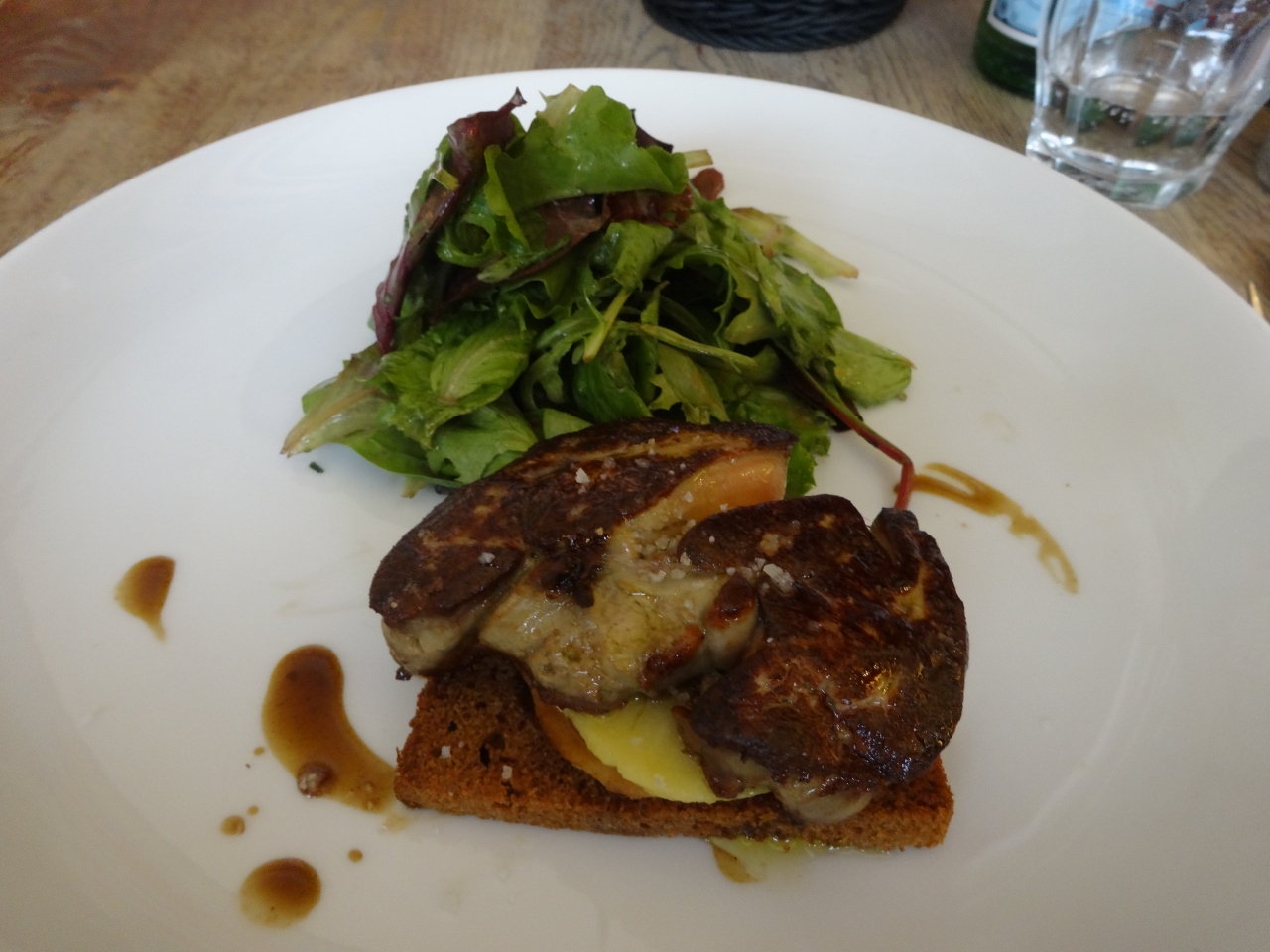フォアグラのポアレを食べたくて。夏は、クロ−ズしていて、やっとこの店を見つけた。他の人は、ムニュのランチを食べていたが、フォアグラポアレと言ったら通じた。ただ、飲み物をキャラフドロ-と言っても通じずペリエけいの炭酸水を持ってきた。後で、グラスワインを頼むと機嫌よく持ってきた。帰りに隣の食材店に寄った。こちらには、テリ−ヌとかテイクアウトできて、パンにはさんでサンドイッチにして購入している人もいた。英語よりフランス語のほうが通じる感じだった。
