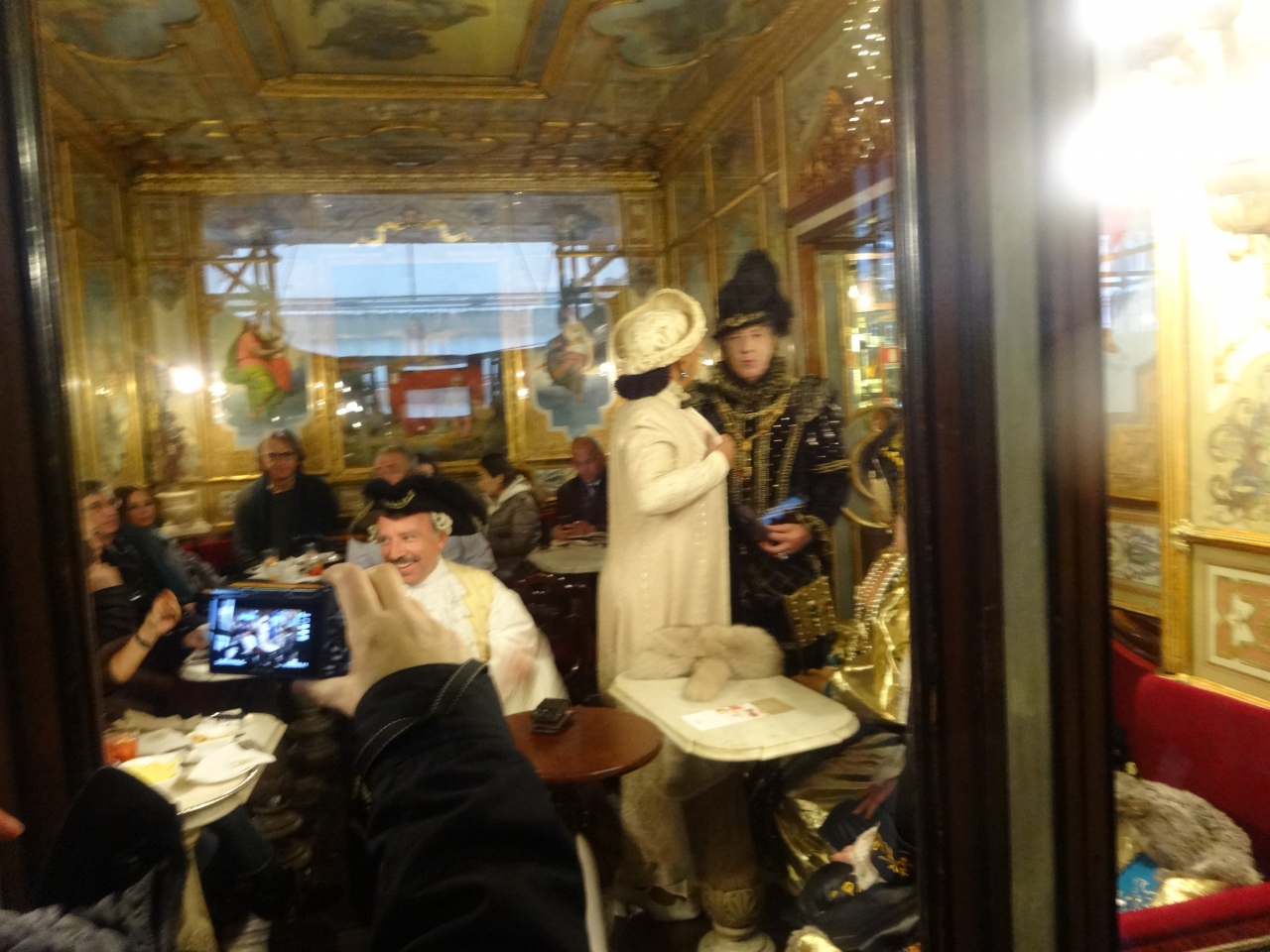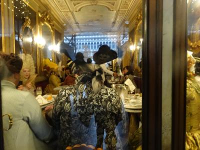 カ-ニバルの季節に行きました。お店の入り口に多くの人が並んでいて、入れませんでした。広場に面している大きな窓から中を覗くと、店内には、カ-ニバルの衣装として中世の貴族の姿で飲んだりしている人たちが見えて店内の壁紙やインテリアとマッチしていて、美しくまるでタイムスリップしているようでした。前回訪れた際、店内で飲みましたが、ちょっと高めのお値段でした。