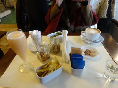 外の席がカ-ニバルのため使えなくて、店内のみだった。店内は、2か所二分かれていて、狭いほうの部屋の席が空いていたのでそちらに座った。持ち帰りの人も多くいた。店内の飲み物の価格は、とても高くカプチ-ノも10ユ-ロ以上していて、アルコ-ルが20ユ-ロくらいからだったので、アルコ-ル、カクテルを注文した。飲み物以外に、乾きもののチップやオリ-ブやナッツなどがついてきた。ゆっくり休憩しながら、カーニバル衣装を来た人を店内から見ることができて良かった。